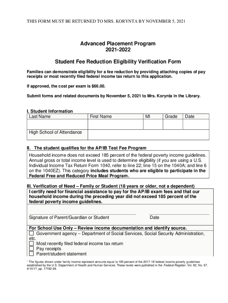 THIS FORM MUST BE RETURNED TO MRS. KOREA BY NOVEMBER 5, 2021Advanced Placement Program 20212022 Student Fee Reduction Eligibility Verification Form Families can demonstrate eligibility for a fee reduction