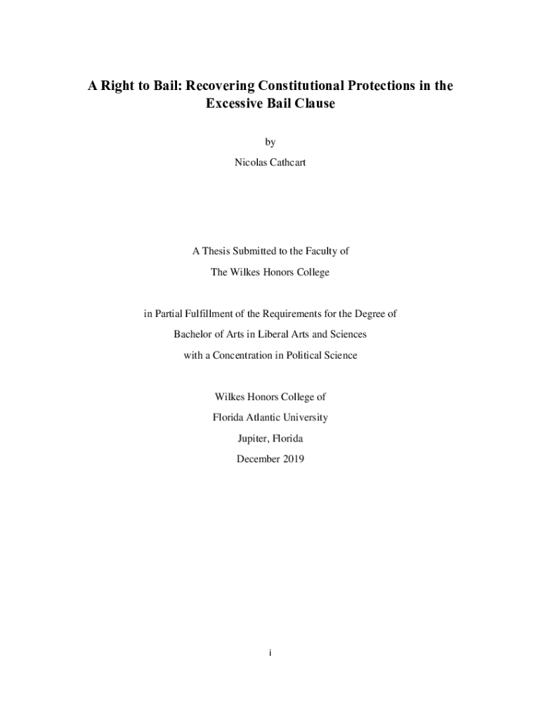 A Right to Bail: Recovering Constitutional Protections in the Excessive Bail Clause by Nicolas Cathartic Thesis Submitted to the Faculty of The Wilkes Honors College in Partial Fulfillment of the