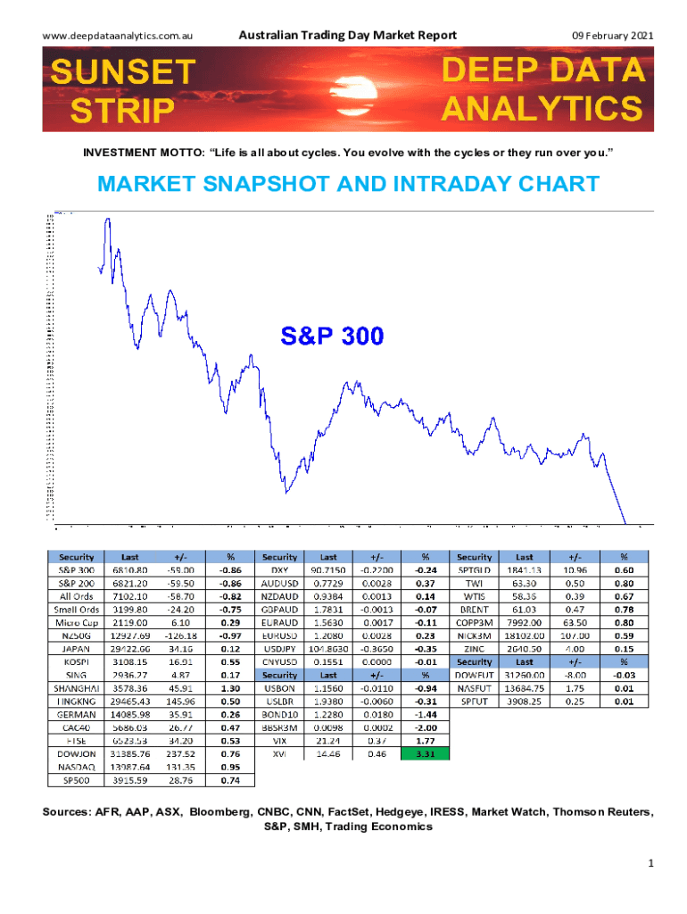 WWW.deepdataanalytics.com. Australian Trading Day Market Report09 February 2021INVESTMENT MOTTO: Life is all about cycles. You evolve with the cycles, or they run over you. MARKET SNAPSHOT AND INTRADAY