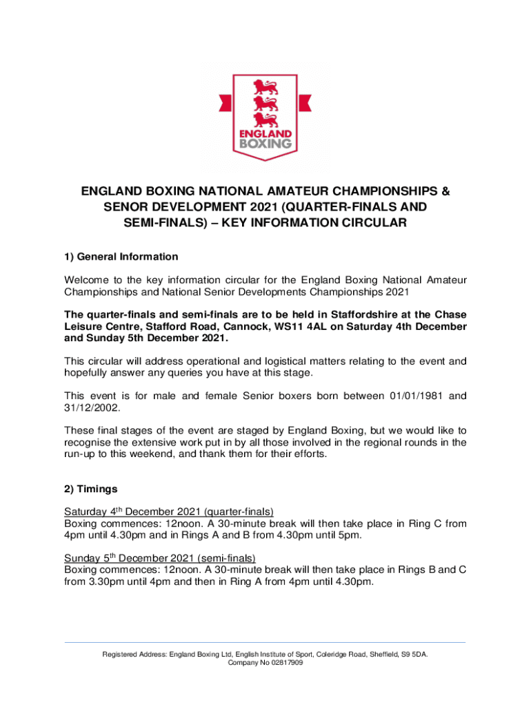 ENGLAND BOXING NATIONAL AMATEUR CHAMPIONSHIPS & Señores DEVELOPMENT 2021 (QUARTERFINALS AND SEMIFINALS) KEY INFORMATION CIRCULAR 1) General Information Welcome to the key information circular for