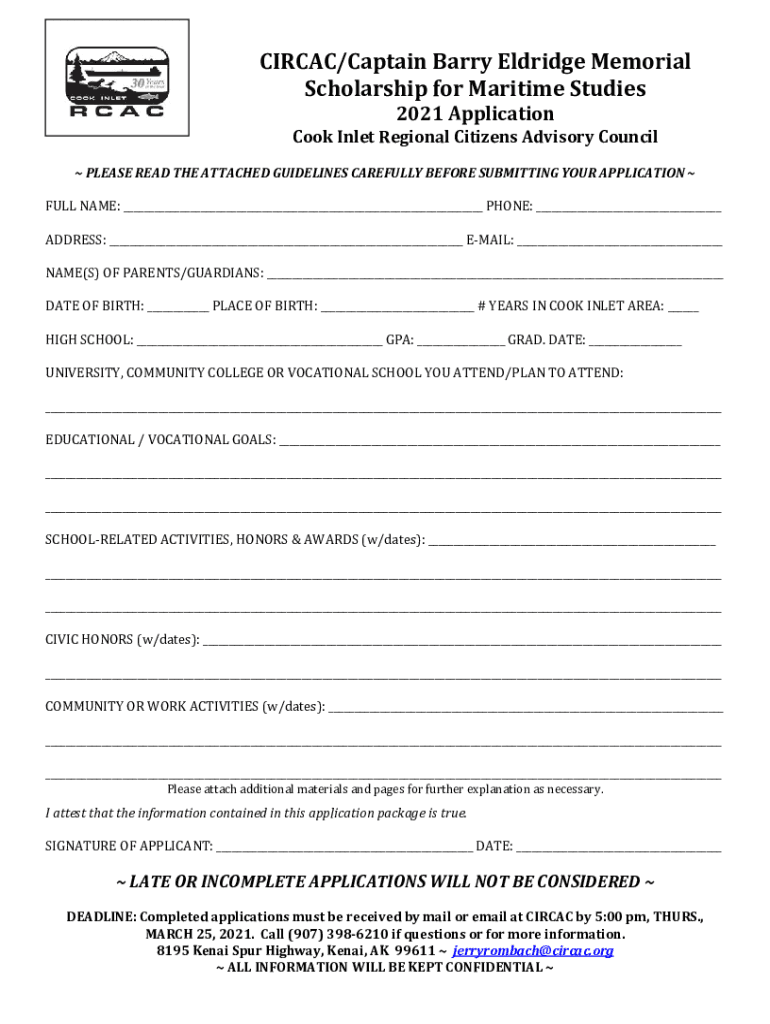 CIRCA/Captain Barry Eldridge MemorialScholarship for Maritime Studies2021 Application Cook Inlet Regional Citizens Advisory Council PLEASE READ THE ATTACHED GUIDELINES CAREFULLY BEFORE SUBMITTING