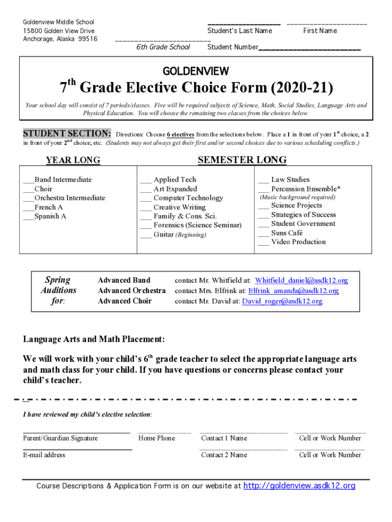 Golden view Middle School 15800 Golden View Drive Anchorage, Alaska 99516______Students Last NameFirst Name___6th Grade SchoolStudent Number___GOLDENVIEW7th Grade Elective Choice Form (202021) Your