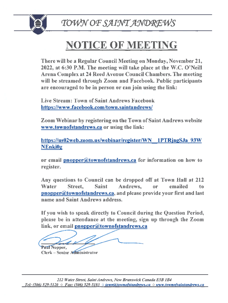 TOWN OF SAINT ANDREWS REGULAR COUNCIL MEETING AGENDA Monday, November 21, 2022, 6:30 p.m. W.C. O\'Neill Arena Pages A.RECORDING OF ATTENDANCE.LAND RECOGNITION OF THE PESKOTOMUHKATI NATION Welcome,