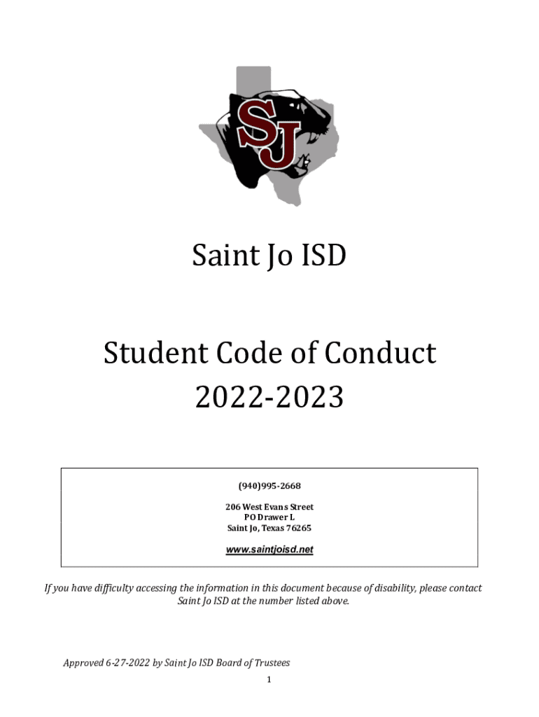 Saint Jo ISD Student Code of Conduct 20222023 (940)9952668 206 West Evans Street PO Drawer L Saint Jo, Texas 76265www.sainthood.net you have difficulty accessing the information in this document because