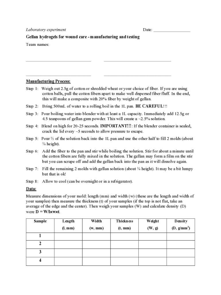 Laboratory experimental: ___German hydrogels for wound care manufacturing and testing Team names: ____________Manufacturing Process: Step 1: Weigh out 2.5g of cotton or shredded wheat or your choice