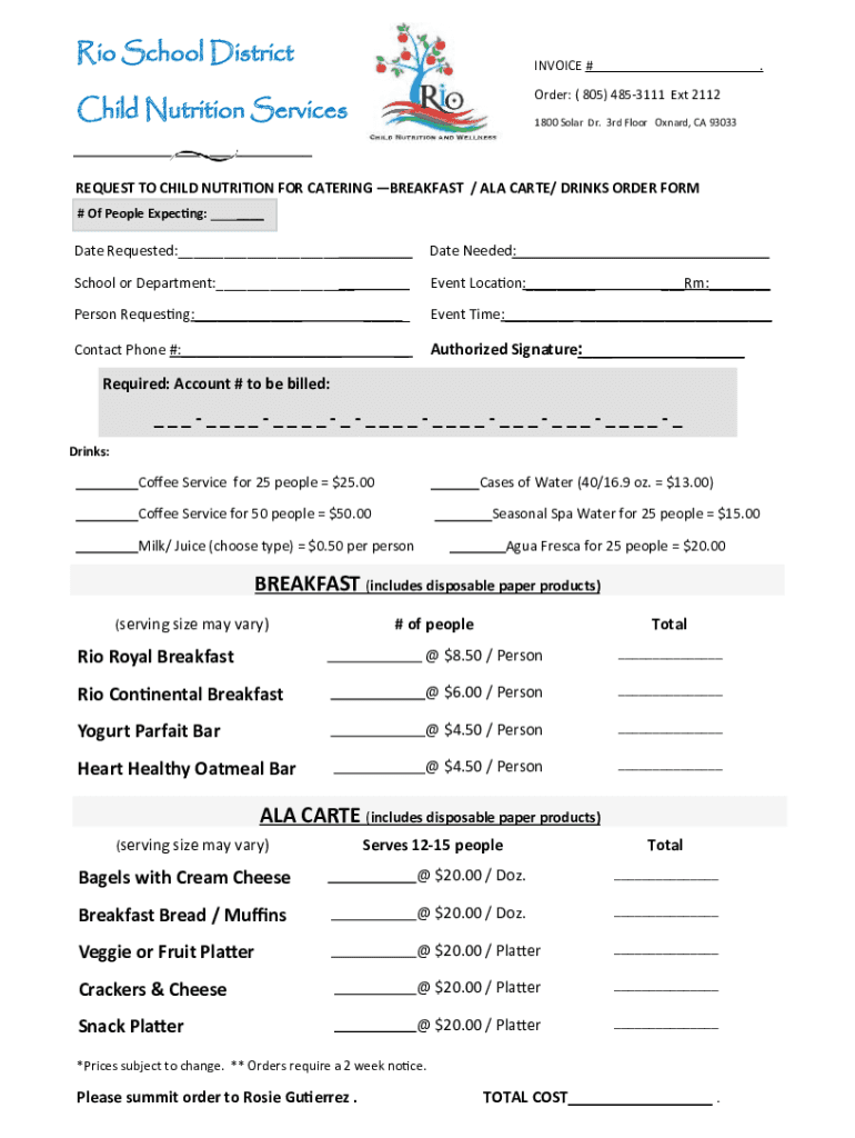 Rio School DistrictINVOICE #. Order: (805) 4853111 Ext 2112Child Nutrition Services1800 Solar Dr. 3rd Floor Oxnard, CA 93033REQUEST TO CHILD NUTRITION FOR CATERING BREAKFAST / ALA CARE/ DRINKS ORDER