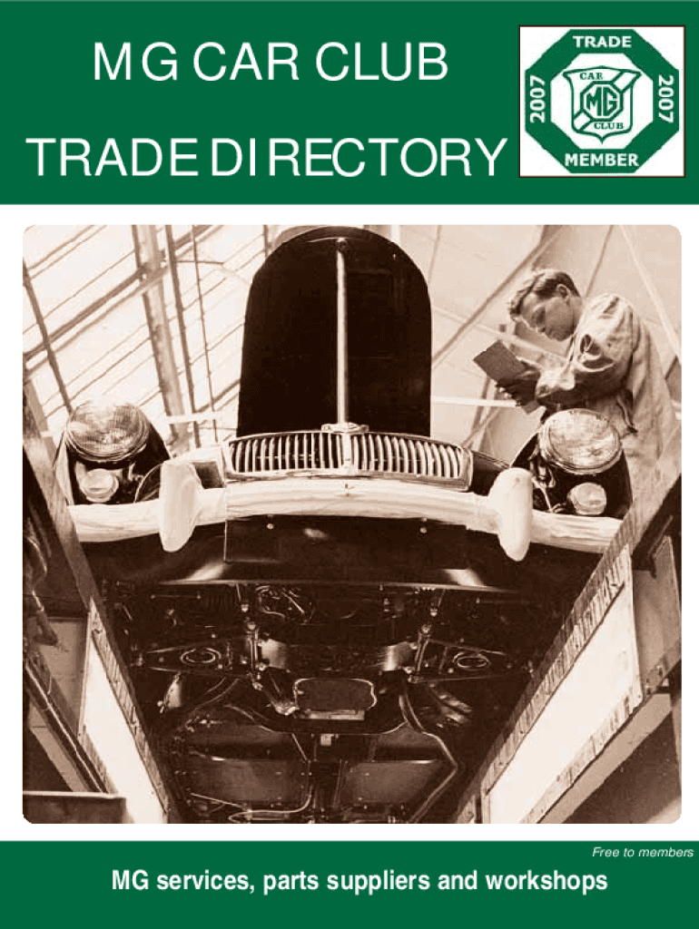 MG CAR CLUB TRADE DIRECTORYFree to members MG services, parts suppliers and workshopsLook out for this soothe MG Car Club Trade Membership Scheme was introduced to ensure that Club members gain access