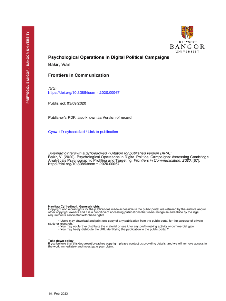 PRIFYSGOL BANGOR / B ANGER UNIVERSITYPsychological Operations in Digital Political Campaigns Baker, Via Frontiers in Communication DOI: https://doi.org/10.3389/fcomm.2020.00067 Published: 03/09/2020Publisher\'s
