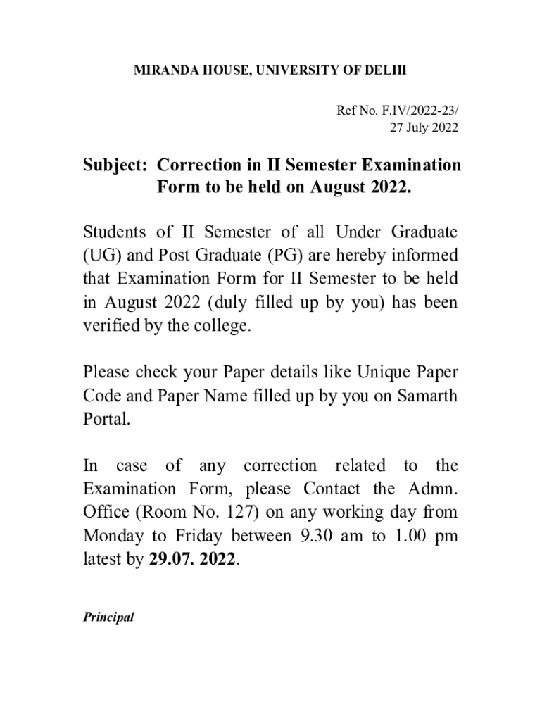 MIRANDA HOUSE, UNIVERSITY OF DELHI Ref No. F.IV/202223/ 27 July 2022Subject: Correction in II Semester Examination Form to be held on August 2022. Students of II Semester of all Undergraduate (UG)