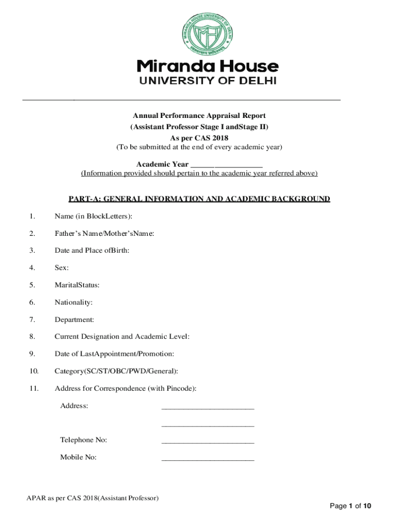Annual Performance Appraisal Report (Assistant Professor Stage I onstage II) As per CAS 2018 (To be submitted at the end of every academic year) Academic Year ___ (Information provided should pertain