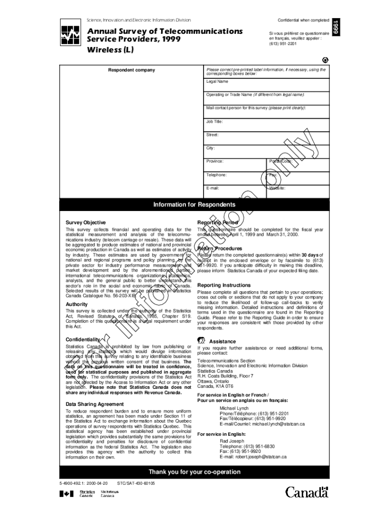 Annual Survey of Telecommunications Service Providers, 1999 Wireless (L)Si vows Perez CE questionnaire en Francis, vehicle appear : (613) 9512201Please correct preprinted label information, if necessary,