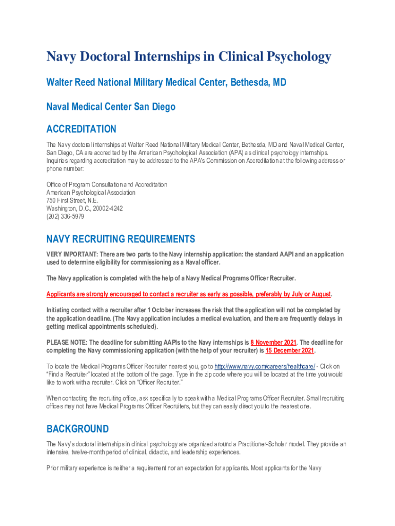 Navy Doctoral Internships in Clinical Psychology Walter Reed National Military Medical Center, Bethesda, MD Naval Medical Center San Diego ACCREDITATION The Navy doctoral internships at Walter Reed