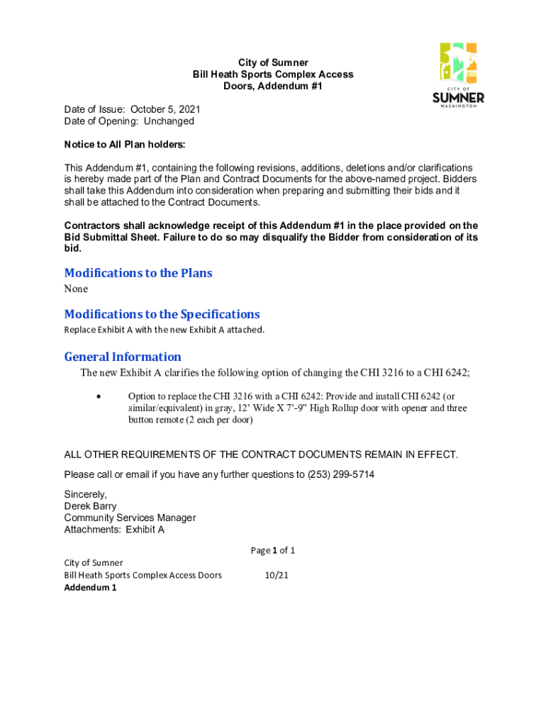 City of Sumner Bill Heath Sports Complex Access Doors, Addendum #1 Date of Issue: October 5, 2021, Date of Opening: Unchanged Notice to All Plan holders: This Addendum #1, containing the following