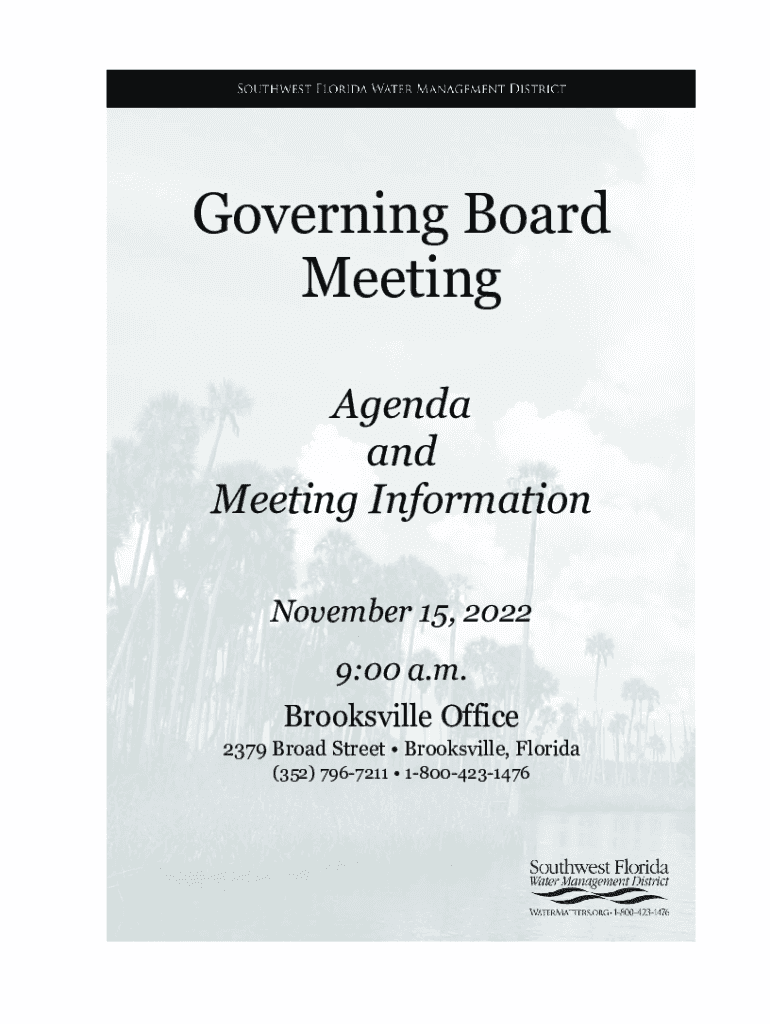SOUTHWEST FLORIDA WATER MANAGEMENT DISTRICTGoverning Board Meeting Agenda and Meeting Information November 15, 2022 9:00 a.m. Brookville Office 2379 Broad Street Brookville, Florida (352) 7967211