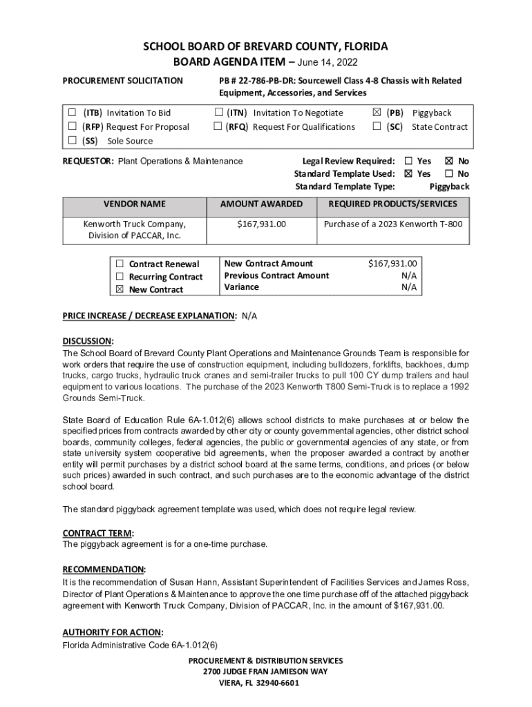 SCHOOL BOARD OF BREVARD COUNTY, FLORIDA BOARD AGENDA ITEM June 14, 2022, PROCUREMENT SOLICITATION PB # 22786PBDR: Source well Class 48 Chassis with Related Equipment, Accessories, and Services (ITB)