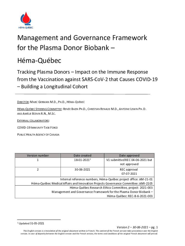 Management and Governance Framework for the Plasma Donor Biobank HmaQubec Tracking Plasma Donors Impact on the Immune Response from the Vaccination against SARSCoV2 that Causes COVID-19 Building a