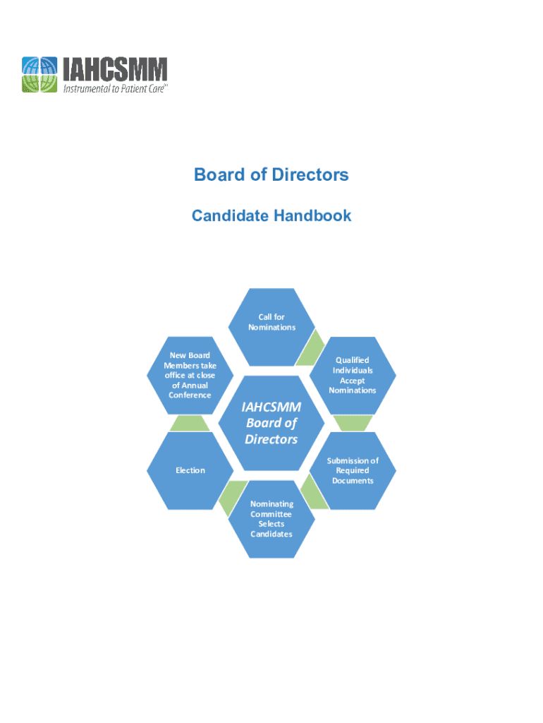 Board of Directors Candidate HandbookCall for Nominations New Board Members take office at close of Annual ConferenceIAHCSMM Board of DirectorsQualified Individuals Accept NominationsSubmission of