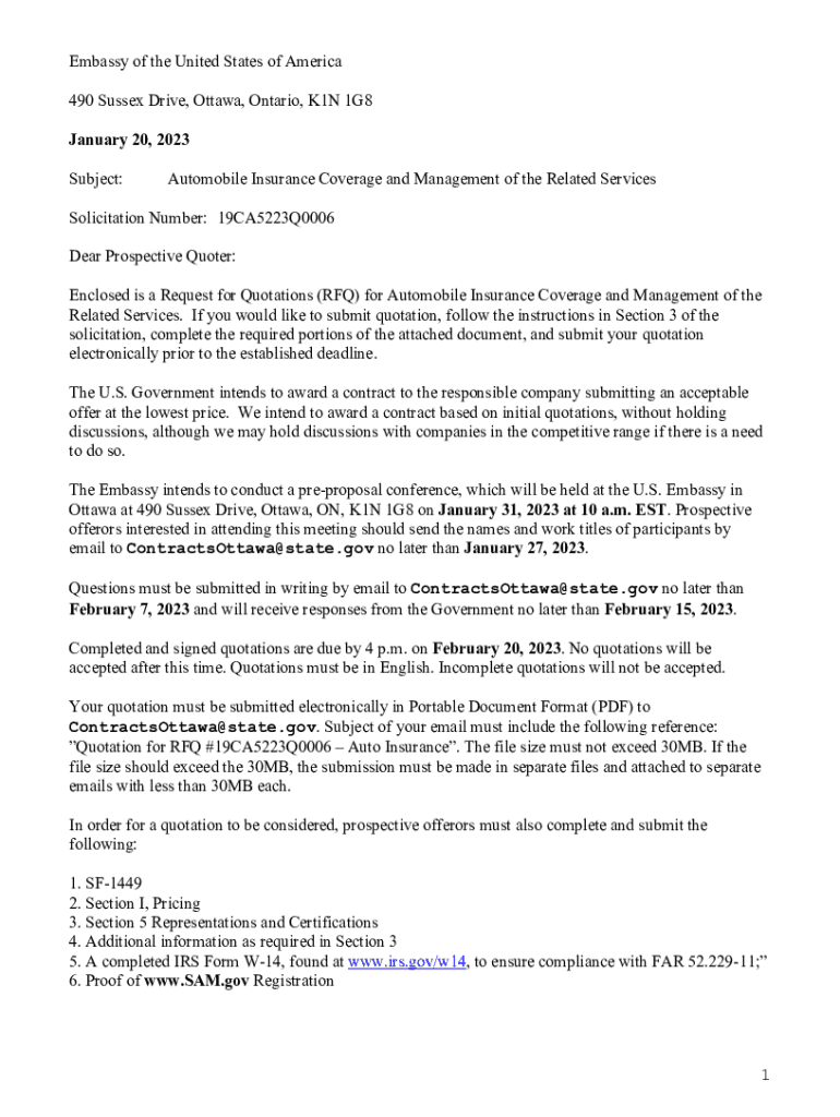 Embassy of the United States of America 490 Sussex Drive, Ottawa, Ontario, K1N 1G8 January 20, 2023, Subject:Automobile Insurance Coverage and Management of the Related ServicesSolicitation Number: