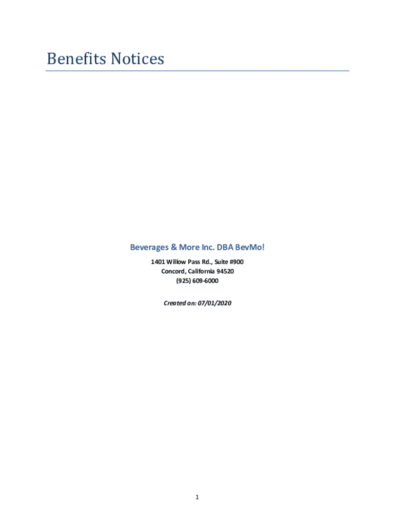 Benefits NoticesBeverages & More Inc. DBA Beam! 1401 Willow Pass Rd., Suite #900 Concord, California 94520 (925) 6096000 Created on: 07/01/20201TABLE OF CONTENTSHealth Insurance Exchange Notice .................................................................................................