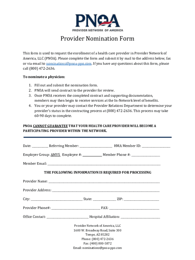Provider Nomination Forms form is used to request the enrollment of a health care provider in Provider Network of America, LLC (PNA). Please complete the form and submit it by mail to the address
