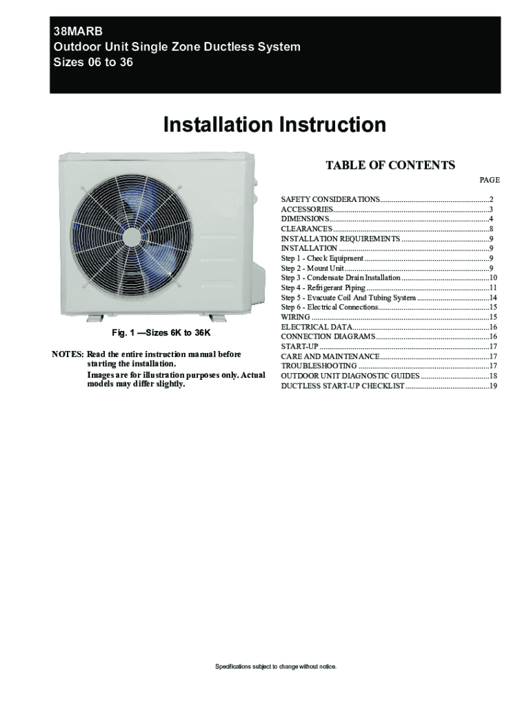 38MARB Outdoor Unit Single Zone Ductless System Sizes 06 to 36Installation Instruction TABLE OF CONTENTS Pacific. 1 Sizes 6K to 36K NOTES: Read the entire instruction manual before starting the installation.