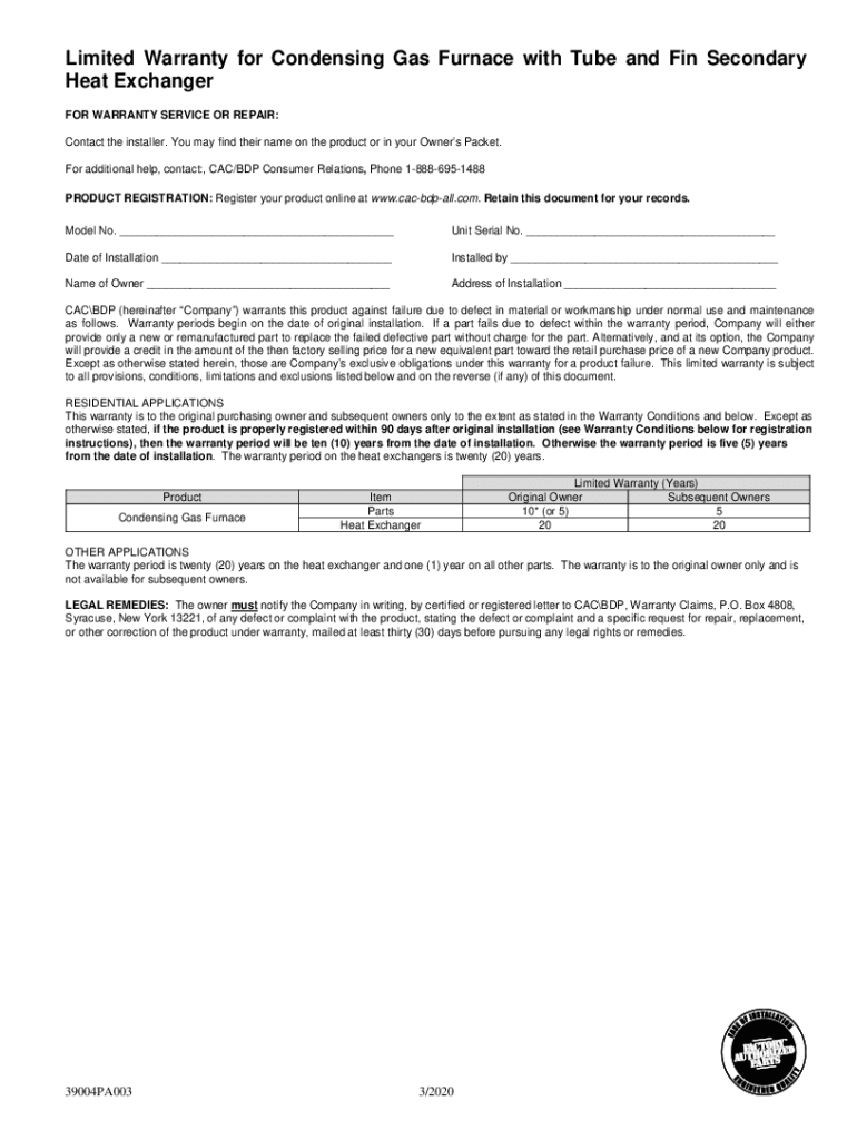 Get the free Limited Warranty for Condensing Gas Furnace with Tube and ...