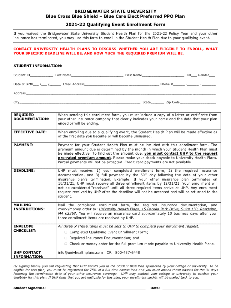 BRIDGEWATER STATE UNIVERSITY Blue Cross Blue Shield Blue Care Elect Preferred PPO Plan 202122 Qualifying Event Enrollment Form If you waived the Bridgewater State University Student Health Plan for