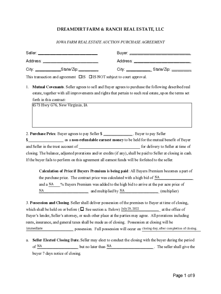 Get the free Auction Purchase Agreement - DreamDirt Farm & Land Auctions
