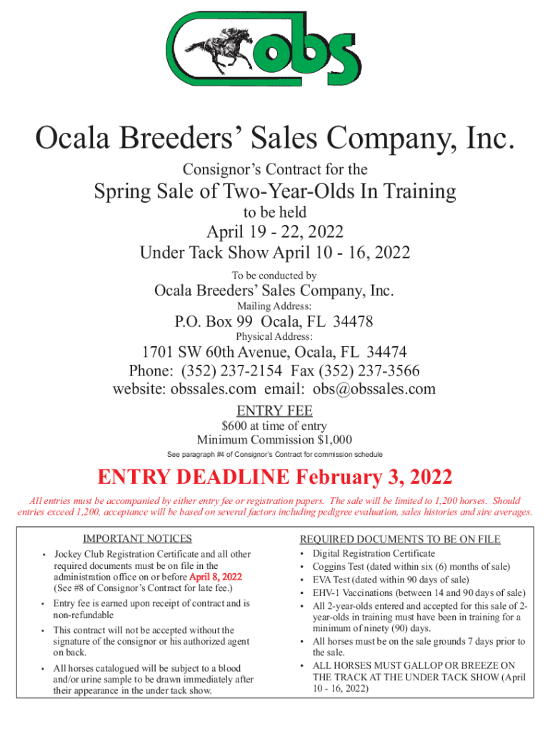 Ocala Breeders Sales Company, Inc. Consignors Contract for helping Sale of TwoYearOlds In Training to be held April 19 22, 2022 Under Tack Show April 10 16, 2022 To be conducted by Ocala Breeders