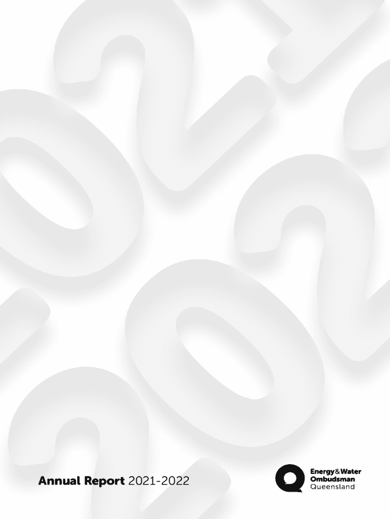 Annual Report 202120220Enargy&\'WatiarOmbudlman Queen Nolan about EWOQAbout this report ENERGY AND WATER OMBUDSMAN QUEENSLAND 202122 ANNUAL REPORT ISSN1839308X Energy and Water Ombudsman Queensland,