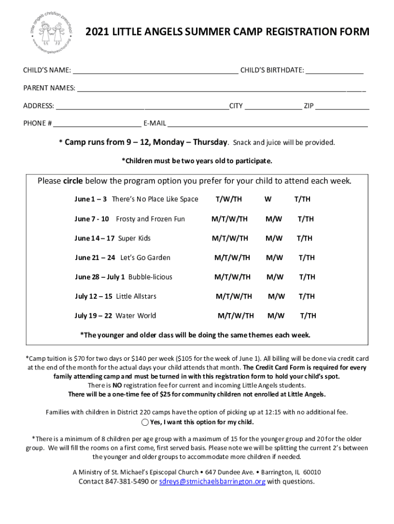 2021 LITTLE ANGELS SUMMER CAMP REGISTRATION FORM CHILD NAME: ___ CHILD BIRTHDATE: ___ PARENT NAMES: ___ ADDRESS: ___CITY ___ ZIP ___ PHONE # ___ EMAIL ___ * Camp runs from 9 12, Monday Thursday. Snack