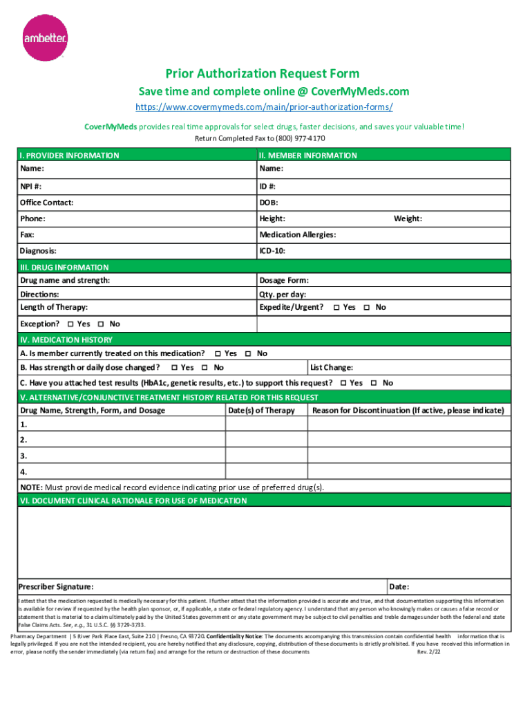 Prior Authorization Request Form Save time and complete online @ CoverMyMeds.com https://www.covermymeds.com/main/priorauthorizationforms/ CoverMyMeds provides real time approvals for select drugs,