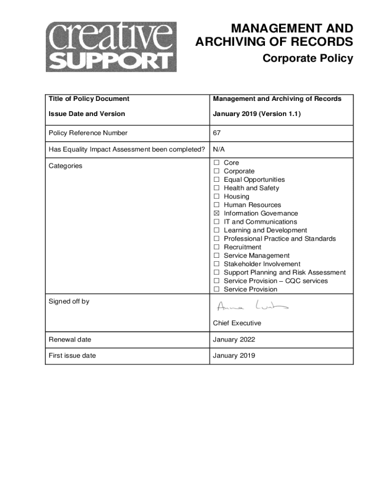 MANAGEMENT AND ARCHIVING OF RECORDS Corporate PolicyTitle of Policy DocumentManagement and Archiving of RecordsIssue Date and Version January 2019 (Version 1.1)Policy Reference Number67Has Equality