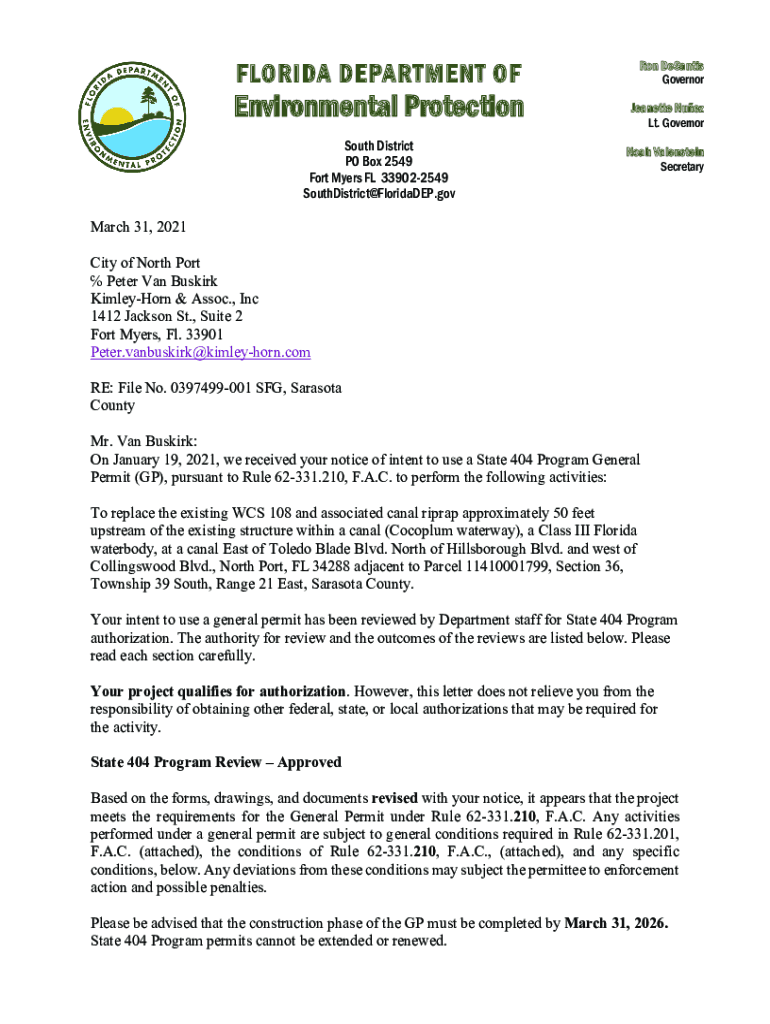 FLORIDA DEPARTMENT Environmental Protection South District PO Box 2549 Fort Myers FL 339022549 SouthDistrict@FloridaDEP.govRon DeSantis Governor Jeanette Suez Lt. Governor Noah Valentin Secretary