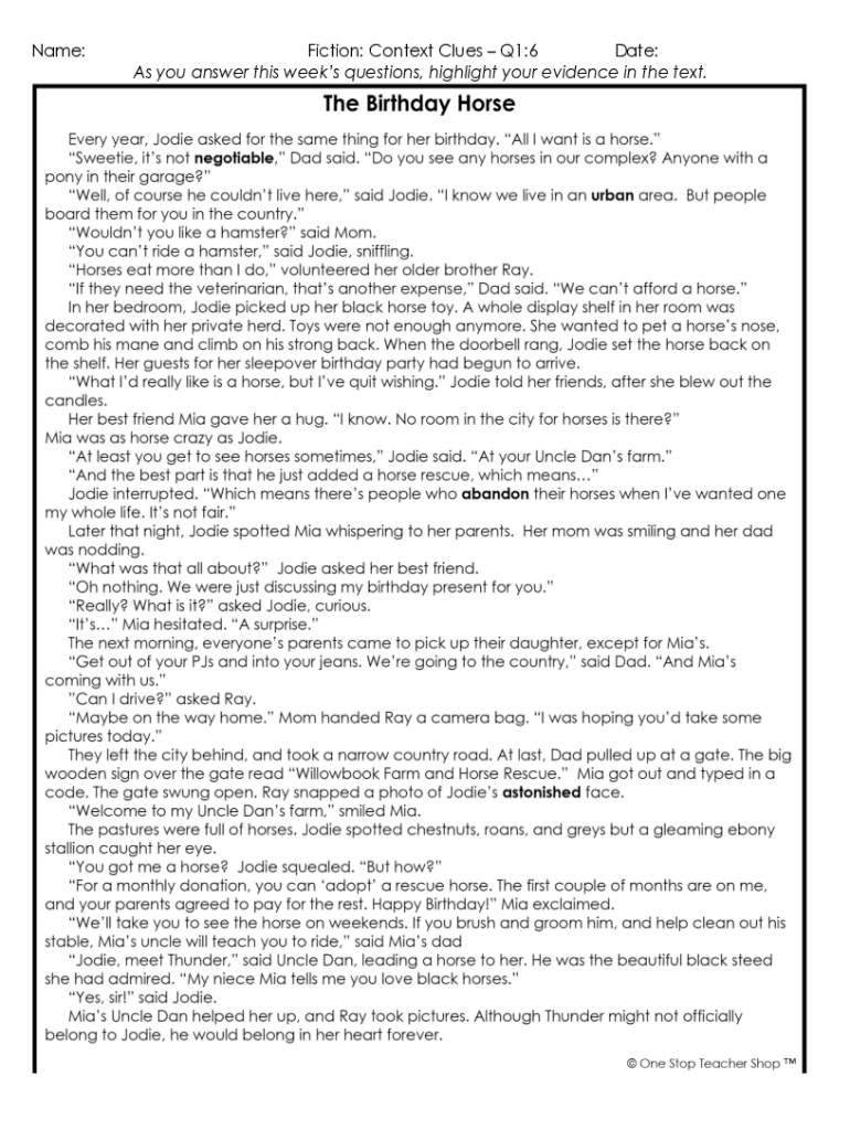 If the pink gorilla eats watermelon every night, how many watermelons does he eat? Name:Fiction: Context Clues Q1:6 Date: As you answer this week's questions, highlight your evidence in the text.