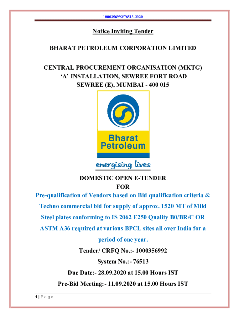 1000356992/765132020Notice Inviting Tender BHARAT PETROLEUM CORPORATION LIMITED CENTRAL PROCUREMENT Organization (MKT) A INSTALLATION, DEGREE FORT ROAD DEGREE (E), MUMBAI 400 015DOMESTIC OPEN TENDER