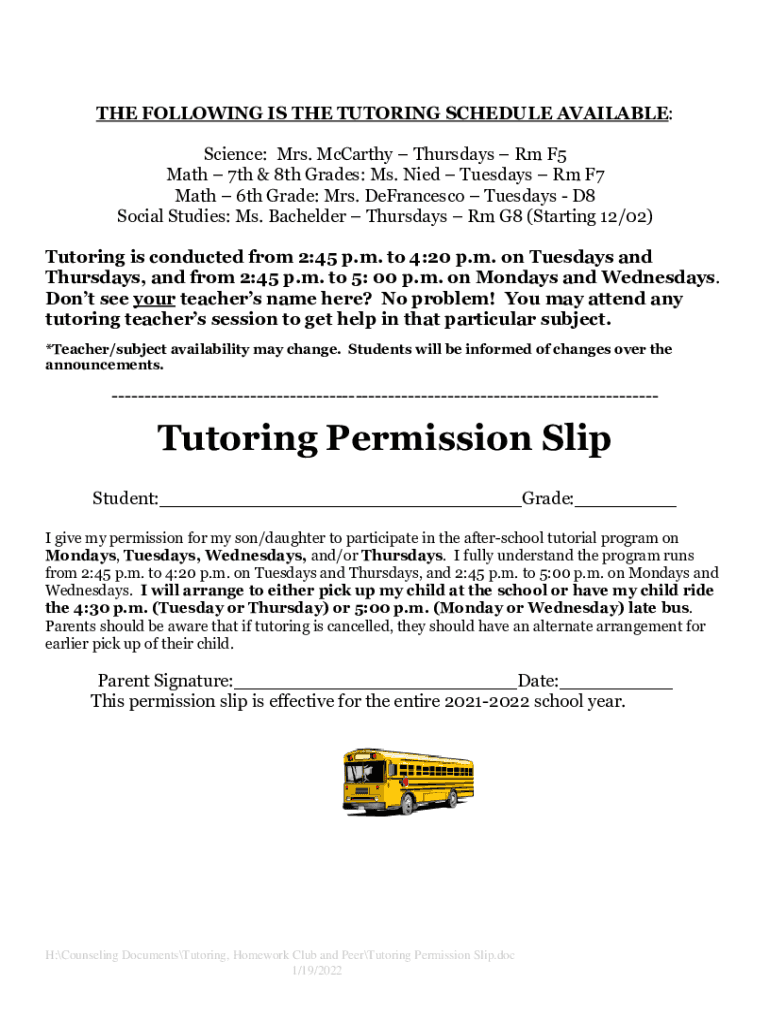 THE FOLLOWING IS THE TUTORING SCHEDULE AVAILABLE: Science: Mrs. McCarthy Thursdays Rm F5 Math 7th & 8th Grades: Ms. Died Tuesdays Rm F7 Math 6th Grade: Mrs. Francesco Tuesdays D8 Social Studies: Ms.