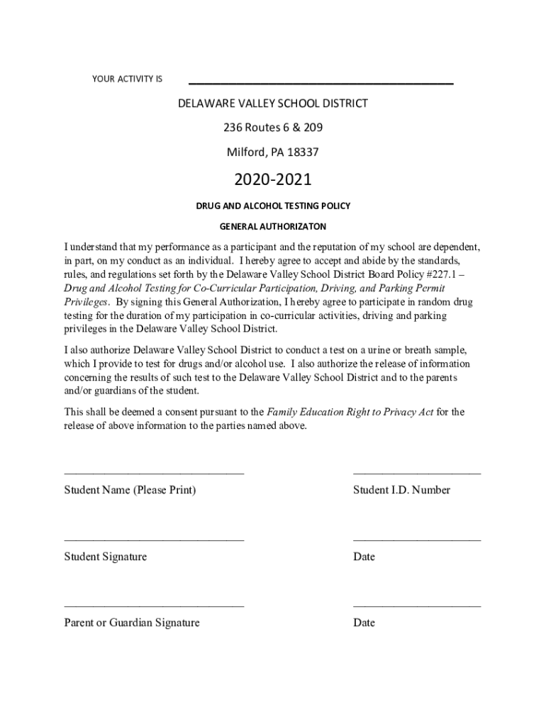 YOUR ACTIVITY IS___ DELAWARE VALLEY SCHOOL DISTRICT 236 Routes 6 & 209 Milford, PA 1833720202021 DRUG AND ALCOHOL TESTING POLICY GENERAL AUTHORIZATION understand that my performance as a participant