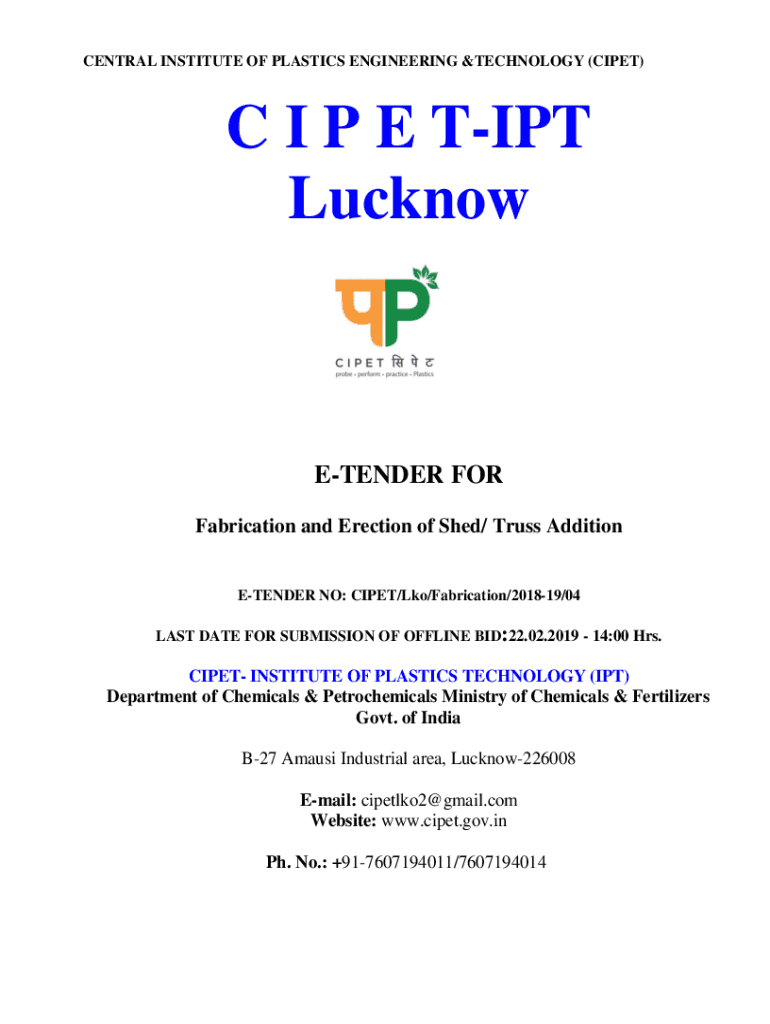 CENTRAL INSTITUTE OF PLASTICS ENGINEERING TECHNOLOGY (CIVET)C I P E TIP LucknowETENDER FOR Fabrication and Erection of Shed/ Truss AdditionETENDER NO: CIVET/KO/Fabrication/201819/04 LAST DATE FOR