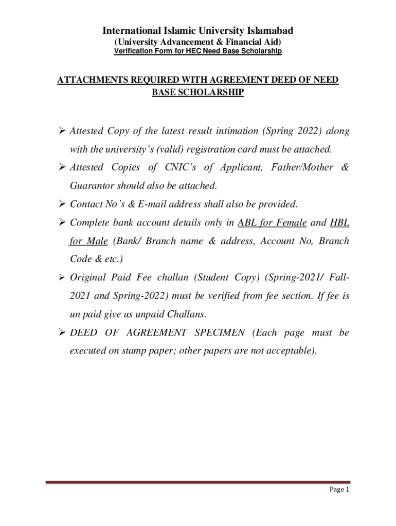 International Islamic University Islamabad (University Advancement & Financial Aid) Verification Form for HEC Need Base ScholarshipATTACHMENTS REQUIRED WITH AGREEMENT DEED OF NEED BASE SCHOLARSHIP