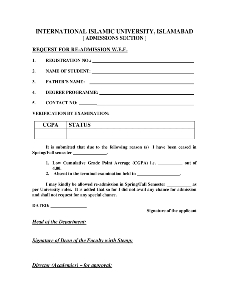 INTERNATIONAL ISLAMIC UNIVERSITY, ISLAMABAD [ADMISSIONS SECTION] REQUEST FOR READMISSION W.E.F. 1.REGISTRATION NO.:2.NAME OF STUDENT:3.FATHERS NAME:4.DEGREE Program:5.CONTACT NO: ___VERIFICATION BY
