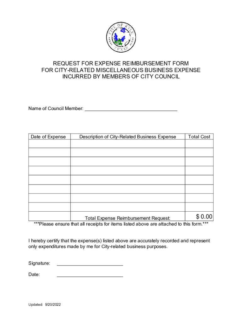 REQUEST FOR EXPENSE REIMBURSEMENT FORM FOR CORRELATED MISCELLANEOUS BUSINESS EXPENSE INCURRED BY MEMBERS OF CITY Councilman of Council Member: ___Date of ExpenseDescription of Correlated Business