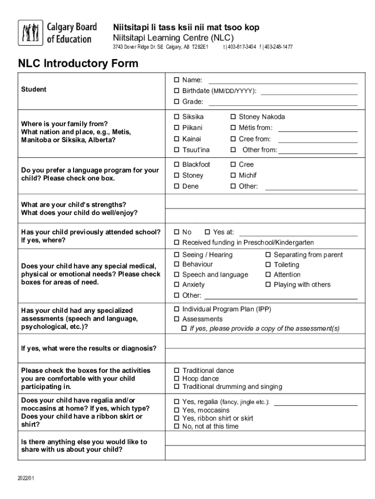 Niitsitapi lit ass SII Wii mat too KOP Niitsitapi Learning Center (NFC)3743 Dover Ridge Dr. SE Calgary, AB T2B2E1t | 4038173404 f | 4032481477NLC Introductory Form Name: Student Birthdate (MM/DD/YYY):