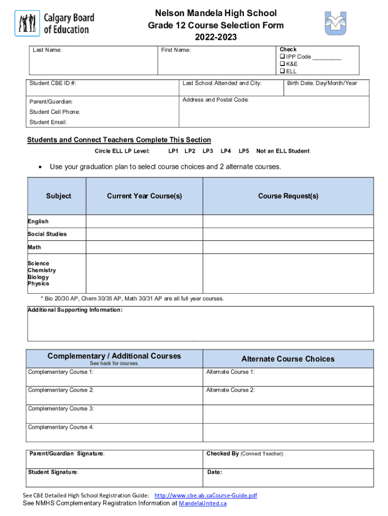 Nelson Mandela High School Grade 12 Course Selection Form 20222023 Last Name:Check IPP Code ___ K&E First Name:Student CBE ID #:Last School Attended and City:Parent/Guardian:Address and Postal Code:Birth