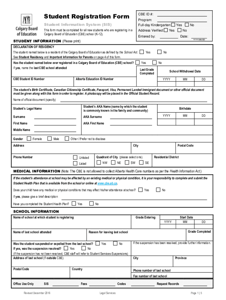 Fill out the student's personal information such as name, address, date of birth, and parent/guardian contact information.