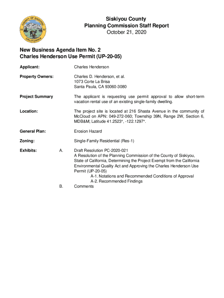 Miskito County Planning Commission Staff Report October 21, 2020, New Business Agenda Item No. 2 Charles Henderson Use Permit (UP2005) Applicant:Charles HendersonProperty Owners:Charles D. Henderson,