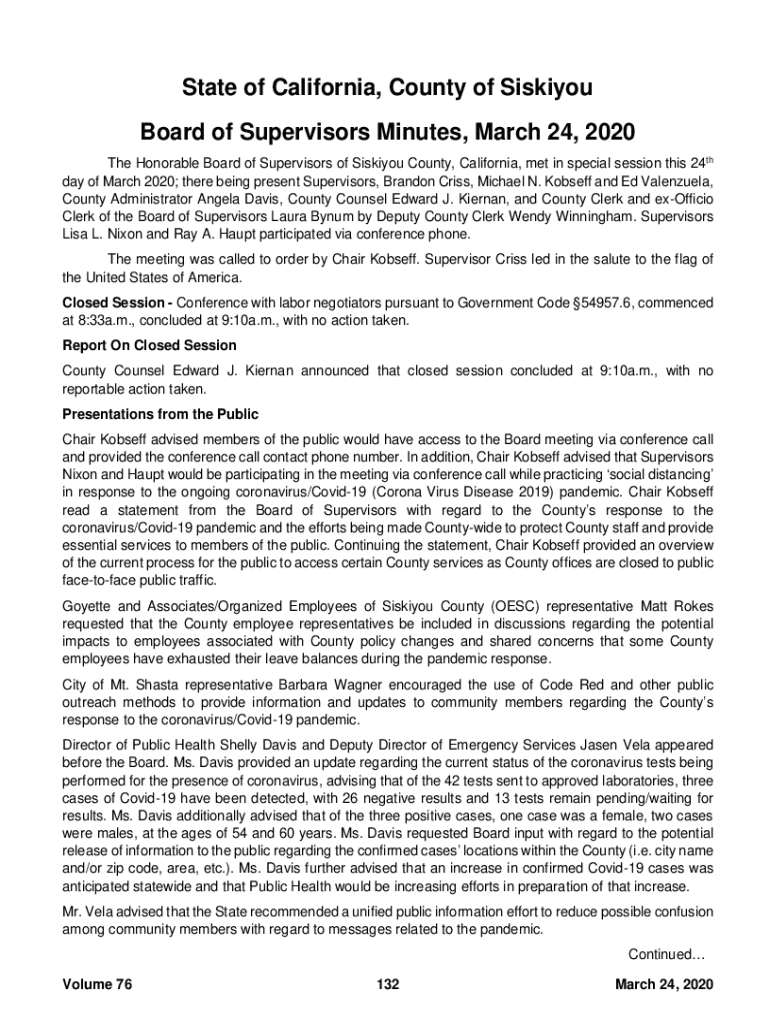 State of California, County of Miskito Board of Supervisors Minutes, March 24, 2020, The Honorable Board of Supervisors of Miskito County, California, met in special session this 24th day of March