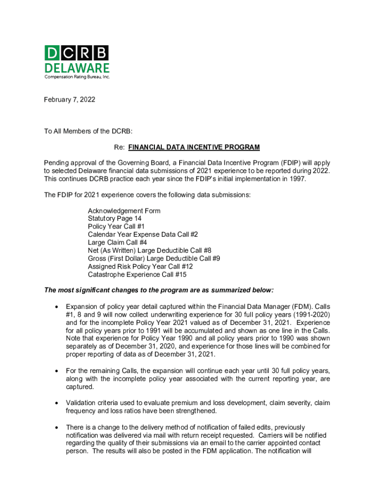 February 7, 2022To All Members of the DCB: Re: FINANCIAL DATA INCENTIVE PROGRAM Pending approval of the Governing Board, a Financial Data Incentive Program (FDP) will apply to selected Delaware financial