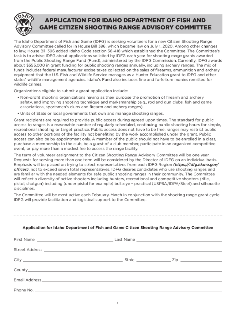 APPLICATION FOR IDAHO DEPARTMENT OF FISH AND GAME CITIZEN SHOOTING RANGE ADVISORY COMMITTEE The Idaho Department of Fish and Game (IDF) is seeking volunteers for a new Citizen Shooting Range Advisory
