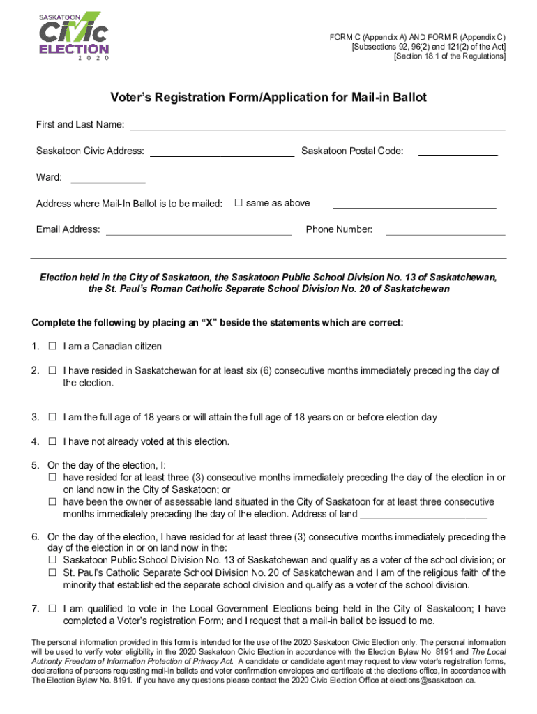 FORM C (Appendix A) AND FORM R (Appendix C) [Subsections 92, 96(2) and 121(2) of the Act] [Section 18.1 of the Regulations]Voters Registration Form/Application for Mailing Ballot First and Last Name:
